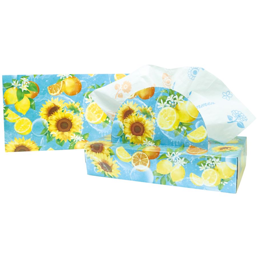 ヒマワリとレモンなどの柑橘類が描かれたパッケージが目印のBOXティッシュです(‘◇’)ゞ