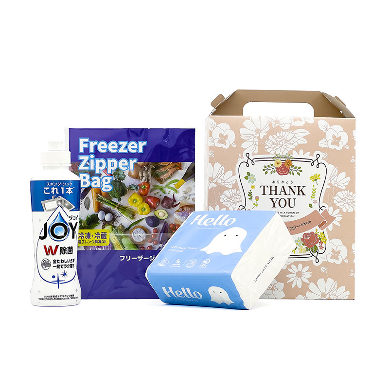 中身はフリーザージッパーバッグ、食器用洗剤、ソフトパックティッシュの3点☆彡